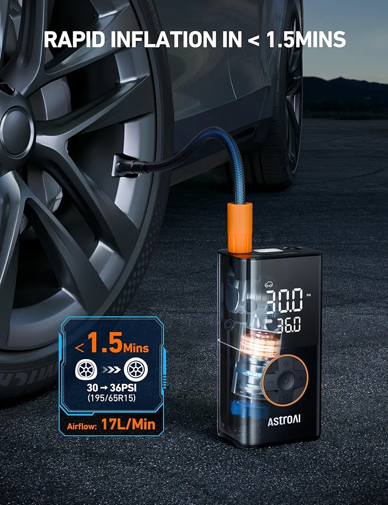 This compact, rechargeable air compressor lets you inflate your tires anytime, anywhere — without relying on gas station air pumps. Simply set your desired PSI on the digital display, press start, and the inflator automatically shuts off once the correct pressure is reached. No guessing. No over-inflating.
